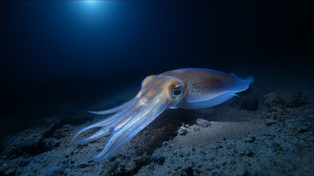 A marine squid glides through deep ocean waters, showcased by soft blue light and sandy seabed