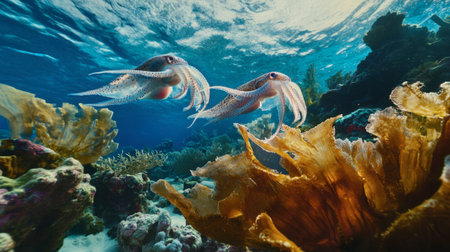 This vibrant underwater scene showcases two majestic octopuses swimming gracefully among colorful corals, exemplifying the beauty of marine life.