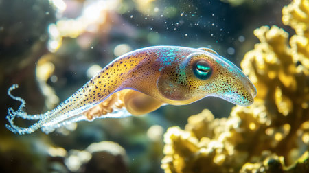 A captivating image of a delicate baby squid gracefully swimming through a vivid coral reef. Its translucent body contrasts with the rich colors of the surrounding aquatic flora, showcasing the beauty of marine life.