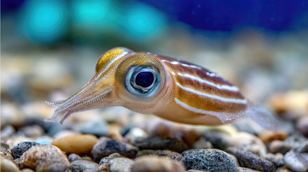 A close-up captures a juvenile cuttlefish showcasing a striped pattern. The marine animal displays a combination of tan and white tones. The aquatic setting includes small rocks, suggesting a shallow water environment. This image could be used for educational, scientific or commercial purposes.