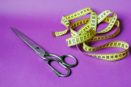 Old metal scissors and a yellow measuring tape on a purple background. Tailor's tools. Manual labor and craft. Close-up. Copy space.
