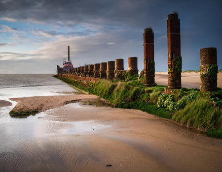 Seascape within misty sunrise , silky sea, wooden poles against a pastel sky. Wooden poles of an abandoned pier
