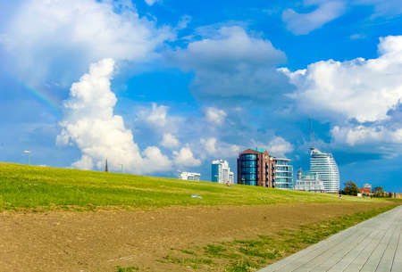 Cityscape and coast panorama of ATLANTIC Hotel Sail City lighthouse architecture ships boats dike and landscape of Bremerhaven in Germany.