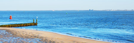Panoramic aerial view of the North sea shore in Vlissingen, the Netherlands. Clear sunny day. Idyllic landscape. Travel destinations, tourism, vacations
