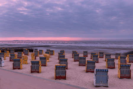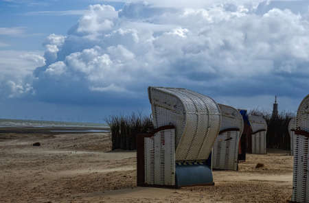 Cuxhaven, Germany - October 06 2019: Roofed wicker beach chair on the beach