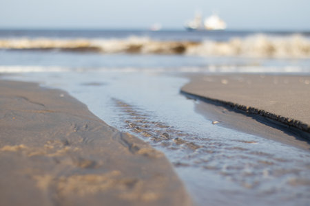 Water flowing towards the North Sea on a Dutch beach on a sunny day