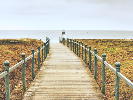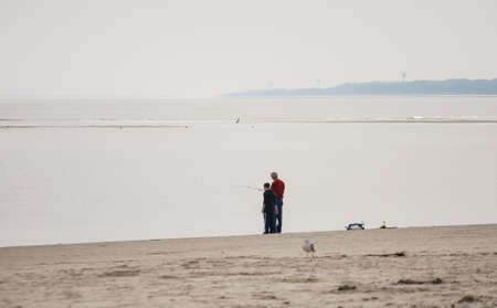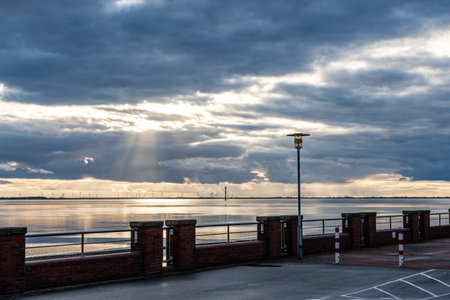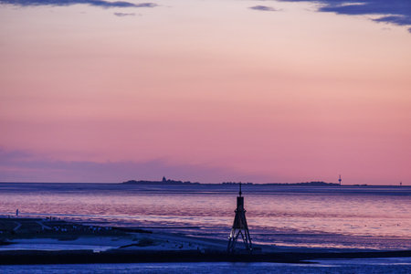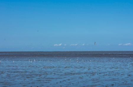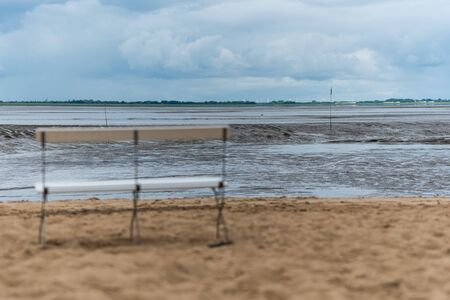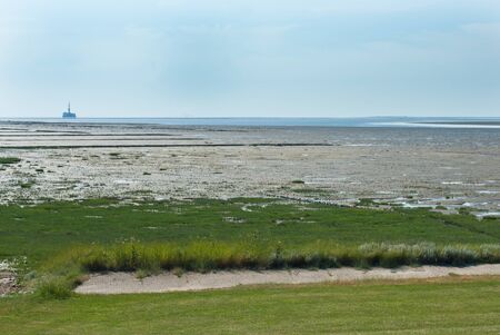 Beautiful North Sea coast of Cuxhaven in Germany. Overcast sky with clouds over the sea at low tide.