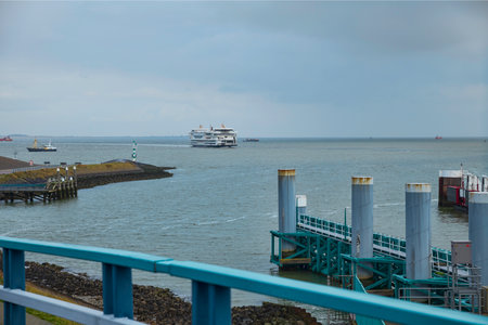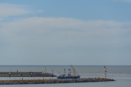 Panorama of ferry approaching Norderney harbor entrance from Wadden Sea, showing East Frisian island coastline in Lower Saxony, Germany
