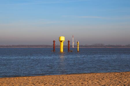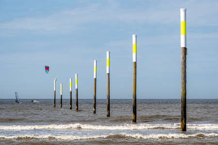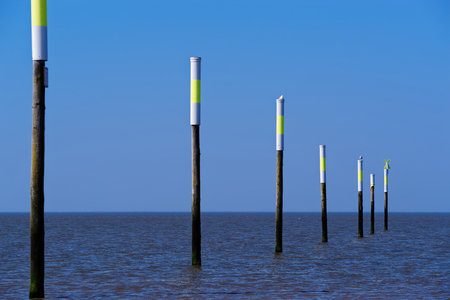 Wooden poles in the north sea against clear blue sky. Sankt Peter-Ording beach, Germany