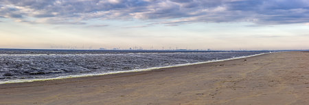Panoramic picture over the beach of Ouddorp in Holland with the silhouette of the port of Rotterdam on the horizon in the evening