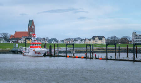 Cuxhaven, Germany - 02.25.2022: Panorama of the city with green flood barrier in the port of Cuxhaven on very early winter morning.