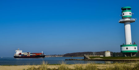 Lighthouse of Warnemuende and sailing ships and boats on the Baltic Sea at the harbor , Germany Rostock