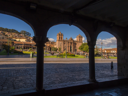 Cuzco in Peru, panoramic view of the Main square an the cathedral church. South America.