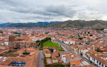 Cityscape of Cuzco, Peru, The Center of the Colonial Old Town from Above with Plaza de Armas and Church of the Society of Jesus.