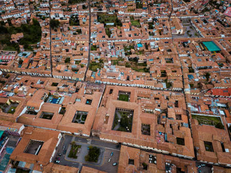 South aerial view over Avenida del Sol and Qorikancha church from Cusco, Peru