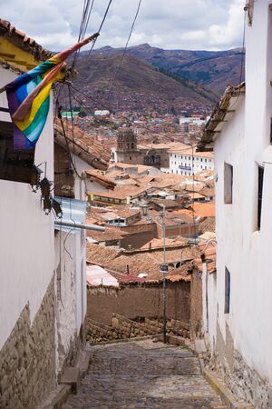 Street scene with a view over the rooftops of Cusco, Peru