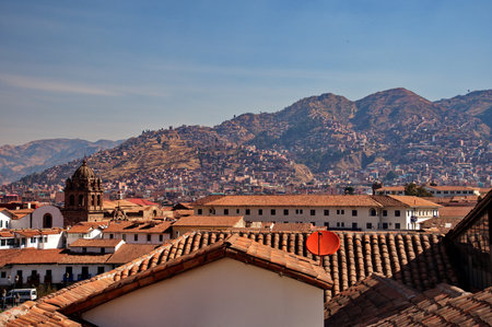 The city of Cusco, Peru, unfolds with terracotta rooftops, colonial architecture, and historic churches, nestled in a valley surrounded by the towering Andes Mountains