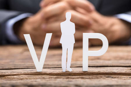 Cropped image of businessman and VIP text on wooden table