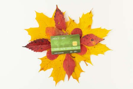 Hello autumn. autumn background with donation inscription and leaves on white background.