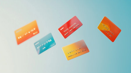 Floating credit and debit cards in vibrant colors on a blue gradient background