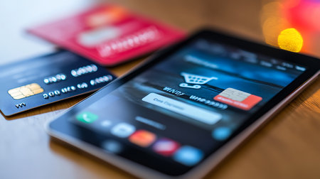 A smartphone displays an online shopping app with credit cards highlighting digital commerce.