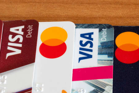 Krakow, Poland - April 29 2022: Close-up Visa and MasterCard credit cards