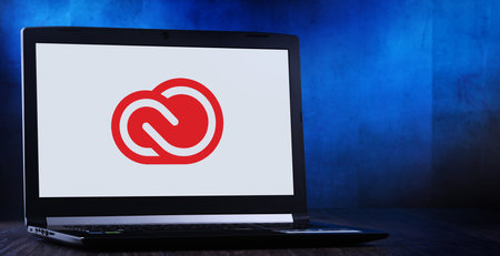 POZNAN, POL - JUL 14, 2020: Laptop computer displaying logo of Adobe Creative Cloud, a set of applications and services from Adobe Systems