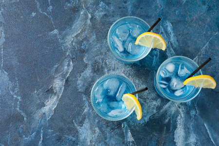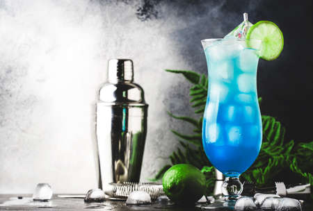 Colorful summer beverage, iced blue alcohol cocktail drink with lime and mint, bark background copy space