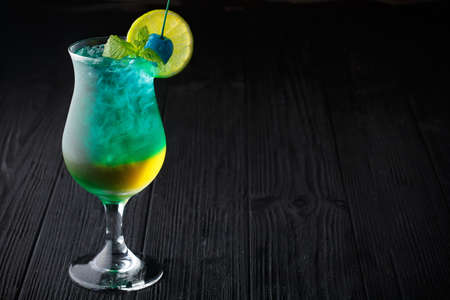 Blue cocktail with ice and lemon on a wooden table in a bar