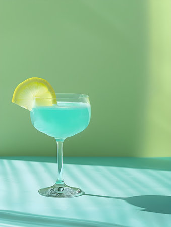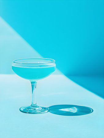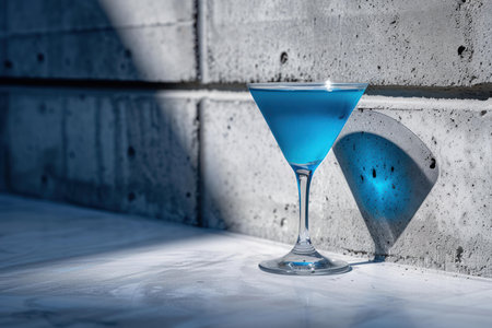 Stylish blue drink in a martini glass against a textured concrete wall with shadows