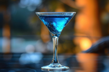 A vibrant blue drink in a classic martini glass, with a bokeh background