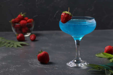 Shimmer edible glitter sparkling blue wine garnish strawberry on dark gray background. Space for text. Close up