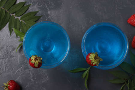 Shimmer edible glitter sparkling blue wine garnish strawberry on dark gray background. Top view.