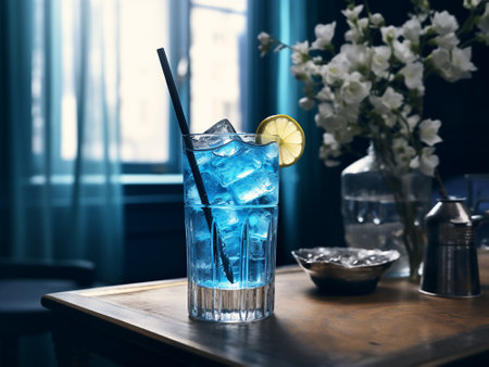 A refreshing bright blue cocktail in a tall glass with ice, garnished with a lemon slice and a flower, sits on a wooden bar with a beautiful bokeh background.