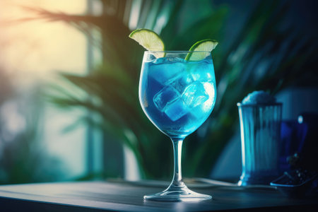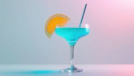 A blue drink with a lemon slice is placed on a table. The background has soft lighting in pastel colors.
