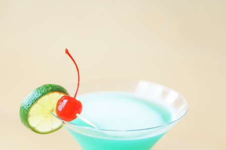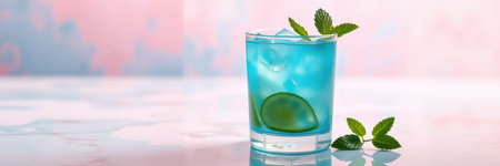 Refreshing blue cocktail served in a glass with lime and mint on a colorful blurred background