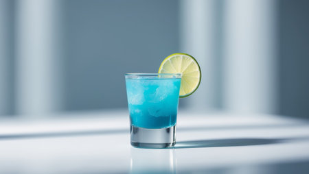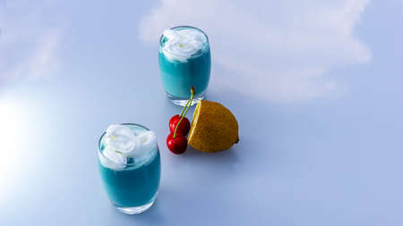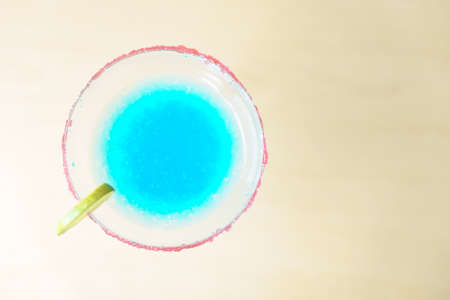 Exotic cold shot glass cocktail with yellow lemon slice, blue curacao, ice cubes, salt rim on soft light mint color background and white wood board.