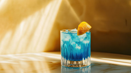 A vibrant blue cocktail served in an elegant glass, garnished with a fresh lemon slice and ice cubes, captures the essence of summer refreshment and style.