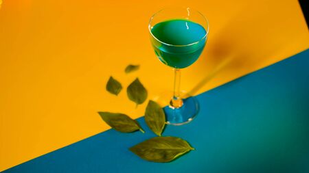 Setting of alcoholic beverage on multi-colored background. Stock footage. Blue alcoholic drink stands on decorative colorful background with green leaves adorning background.