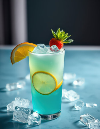 Refreshing blue cocktail garnished with fresh fruit and ice cubes on a vibrant surface