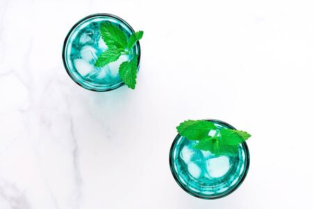 Two beautiful vintage turquoise glasses with cold drink and ice cubes, decorated with fresh green mint leaves on white marble table. Top view.