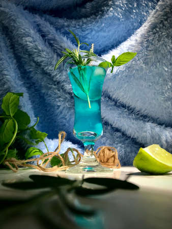 Blue cold drink in a glass with ice cubes on white desk with blue background. Also used mint leaves and rosemary, rope, spoon with natual sunlight from the open window