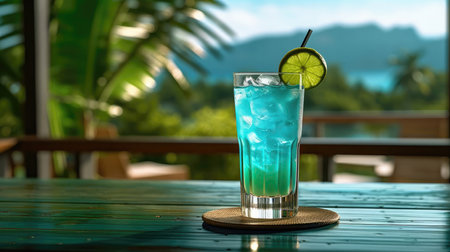 Bright turquoise cocktails with lemon slices set on a textured table by the seaside, evoking a cool and refreshing atmosphere perfect for summer.