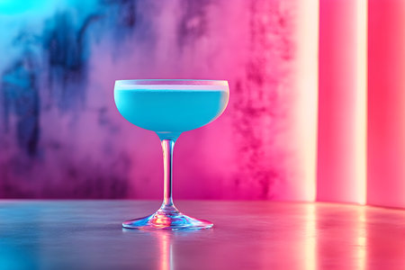 Elegant blue cocktail in a coupe glass, set against a neon pink and blue background