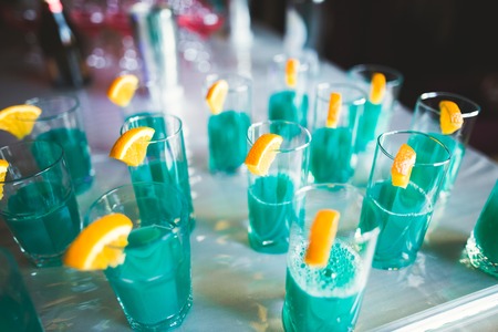 Close-up of very beautiful glass with blue drink stand on bar.