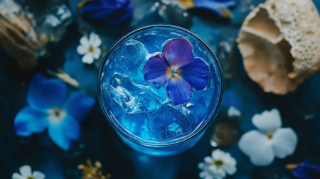 A refreshing blue drink served in a glass with ice and an edible flower garnish. This visually appealing cocktail is perfect for summer gatherings or elegant parties.