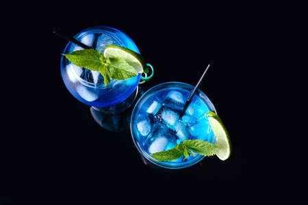 Glasses of Blue cocktail on dark background