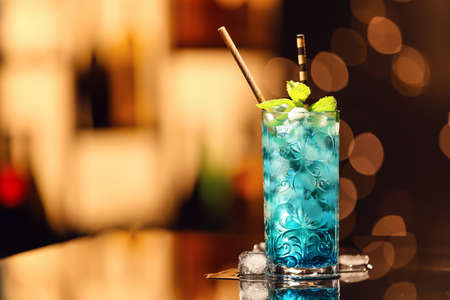 Blue cocktail with ice and lemon on the bar counter in night club