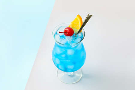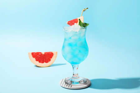 Glass of Blue cocktail on light background