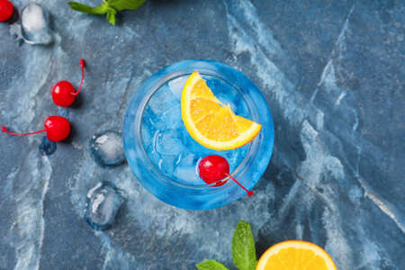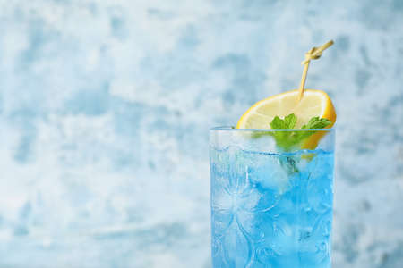 Cocktail with lemon and ice on a blue background. Close-up.